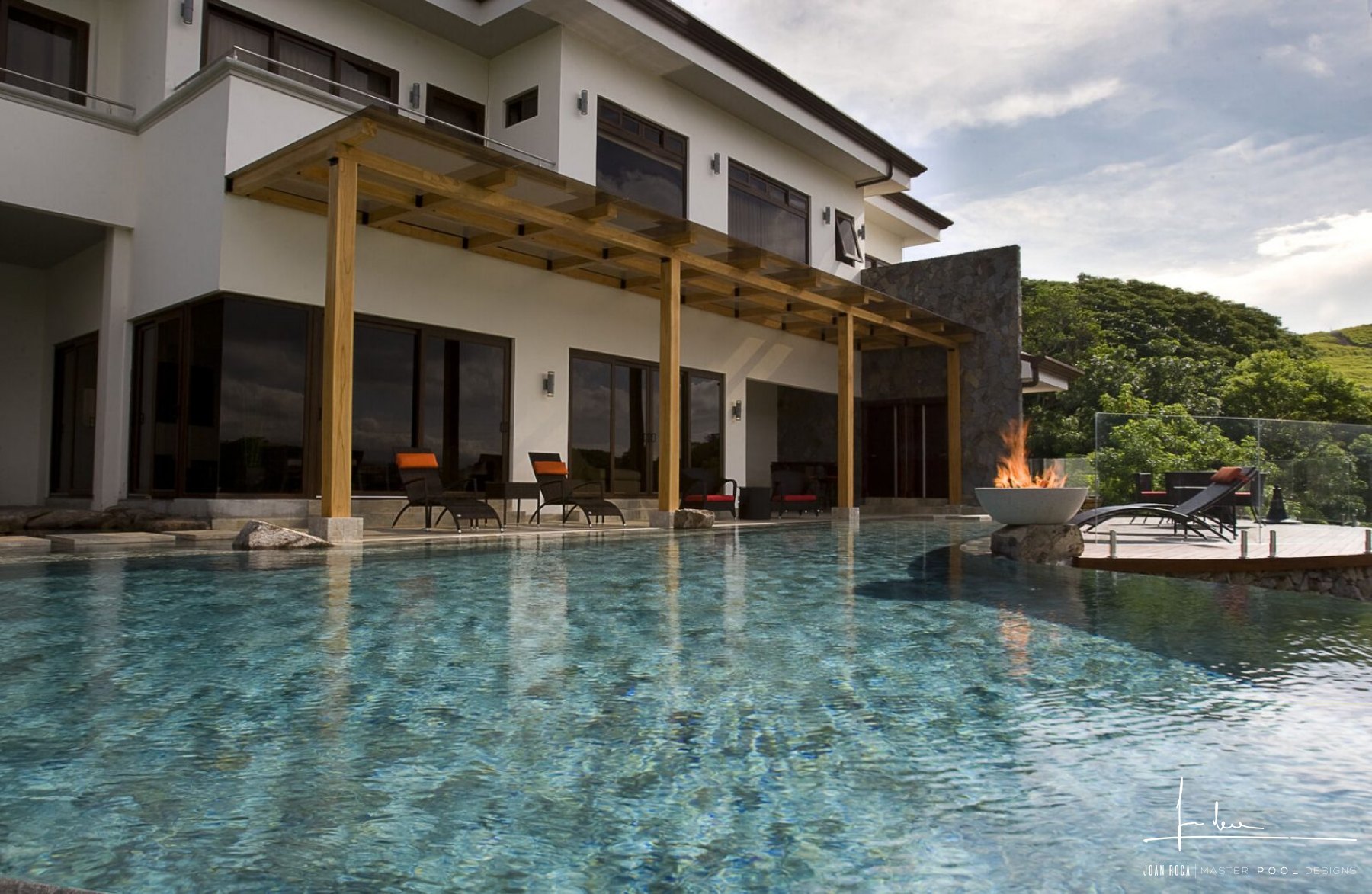 Perched on the side of a Costa Rican mountain 20 feet high from the deck to the lowest point, this masterpiece is tiled with natural stone from Indonesia and blends seamlessly with the horizon.